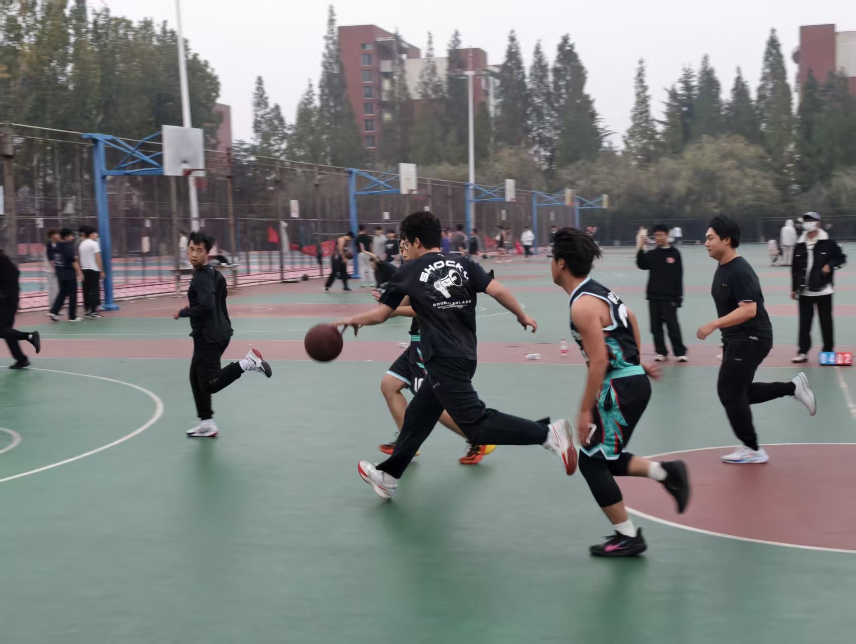 决赛现场气氛紧张而热烈。球员们在场上不遗余力地奔跑、掩护、传球,为每一次得分机会奋力拼搏。精准的远投、精彩的突破上篮,引得场边观众阵阵喝彩。场上队员全神贯注、每球必争,场下各班的啦啦队也热情高涨,加油声、掌声此起彼伏,充分展现了各班级的团结与凝聚力。