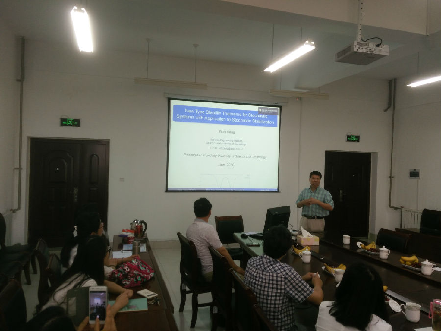 2016年6月11日下午,应“泰山学者”张维海教授的邀请,华南理工大学的邓飞其教授、田森平教授和邢双云副教授,分别作了题为《New Type Stability Theorems for Stochastic Systems with Application to Stochastic Stabilization》、《基于几何分析的迭代学习控制算法研究》和《Mean-Square Admissibility for Stochastic T-S Fuzzy Singular Systems Based on Extended Quadratic Lyapunov Function Approach》的学术报告。本次报告会在J9-525举行,张维海教授主持了报告会,部分教师和研究生参加了报告会。三位专家分别介绍了自己近期取得的研究成果,分享了他们的科研经验和感悟,激励青年教师和研究生们敢于创新、厚积薄发,勇攀科研高峰。整个报告会气氛活跃,学术氛围良好。此次学术报告拓展了研究思路和科研视角,对学生树立远大的学习目标起到积极的推动作用。