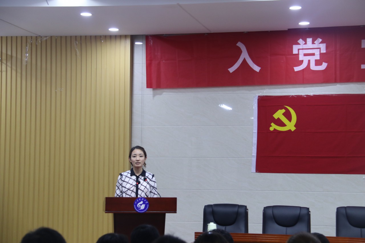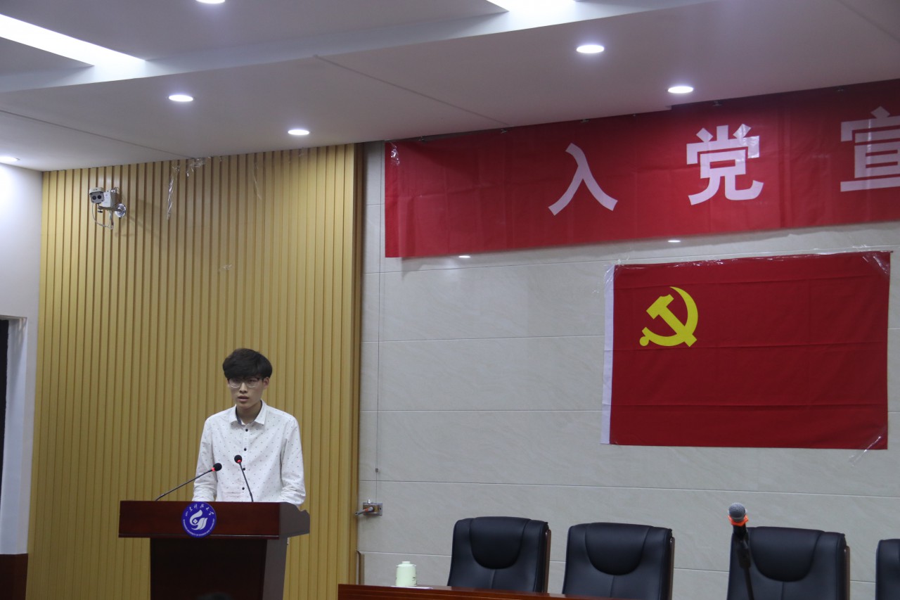 鲜红的党旗,醒目的主题横幅和庄严的宣誓词三者有力地渲染出庄重的气氛现场。大会第一项,全体起立,奏《国际歌》。第二项,党员宣誓仪式。在杨洪骞同志的带领下,全体预备党员右手握拳举过肩头,面向鲜红的党旗庄严宣誓,在激昂的宣誓声中,大家接受了一次身心的洗礼。大会进行到第三项、第四项和第五项,毕业生党员代表郭娜、新党员代表胡向前以及入党积极分子代表殷昌承依次上台发言。几位同志不约而同地表示将会以一名共产党员的标准严格要求自己,不断完善自己,在党组织的领导下继续努力,恪守在党旗下的诺言、自觉加强党性修养。